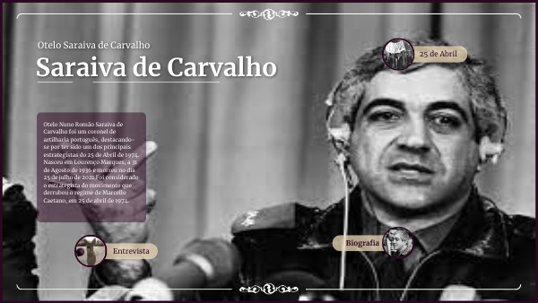 Otelo Nuno Romão Saraiva de Carvalho foi um coronel de artilharia português destacando-se por ter sido um dos principais estrategistas do 25 de Abril. Responsável pelo setor operacional da Comissão Coordenadora e Executiva do Movimento dos Capitães,ajudou a elaborar o plano de operações militares do 25 de Abril de 1974, dirigiu, além disso, as operações com outros militares, a partir do posto da Pontinha. Casou-se em 1960 com Maria Dina Afonso Alambre e teve três filhos: Maria Paula Alambre de Carvalho, Cláudia Marina Alambre de Carvalho e Sérgio Bruno Alambre de Carvalho.