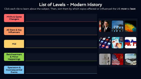 Click each tile to learn about the subject. Then, sort them by which topics affected or influenced the US most to least.