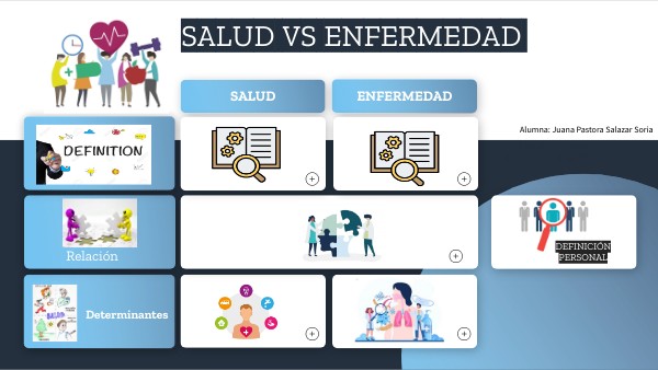 SALUD:Ausencia de todo tipo de malestar, interpretad como dolor, mostrado por la persona. ENFERMEDAD: Presencia de Dolor o molestar presente de manera recurrentes, mostrando síntomas y signos propios.