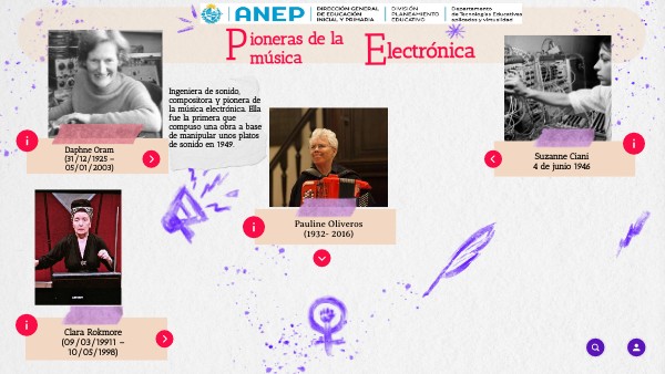 Blogspot.com “Sintonizando con el sonído”[imagen], disponible en:TUNED INTO SOUND: November 2009[Fecha de última consulta: mayo 2024] Ciani Suzanne “The Eighth Wave”[video] en Youtube [www.youtube.com] disponible en:(281) Suzanne Ciani - The Eighth Wave - YouTube[Fecha de última consulta: mayo 2024] Distorvision Blogspot.com “El Theremin …y nació la música electrónica”[imagen], disponible en:DISTORviSION: El THEREMIN....y nació la música electrónica!Música [Fecha de última consulta: mayo 2024] El Centro de la Escucha Profunda “Pauline Oliveros en Deep Listening”[artículo en línea] Disponible en:Escucha Profunda – El Centro para la Escucha Profunda (rpi.edu)[Fecha de última consulta: mayo 2024] Exposé.org “Exploring the Boundaries of Rock” [imagen], disponible en:Exposé Online | Artist info | Suzanne Ciani (expose.org)[Fecha de última consulta: mayo 2024] Found S F. org “Pauline Oliveros: Pionera de la música” [imagen], disponible en:Pauline Oliveros: Pionera musical - Found[Fecha de última consulta: mayo 2024] Finders Keepers Records “ Suzanne Ciani - Lixiviation” (Ronald Mallory Art Film Collaboration)(276) Suzanne Ciani - Lixiviation (Ronald Mallory Art Film Collaboration) - YouTube[Fecha de última consulta: mayo 2024] Flickr.com [imagen], disponible en:Clara Rockmore | Theremin | Victoria Ristenbatt and Scott Redding | Flickr[Fecha de última consulta: mayo 2024] Mujeres con Ciencia “Daphne Oram, la ingeniera de sonido que se convirtió en pionera de la música”[imagen], disponible en Daphne Oram, la ingeniera de sonido que se convirtió en pionera de la música electrónica - Mujeres con ciencia[Fecha de última consulta: mayo 2024] Mujeres y musica.com “Pioneras de la música electrónica”[artículo en línea] Disponible en: Pioneras de la música electrónica | MYM: Mujeres y música (mujeresymusica.com)[Fecha de última consulta: mayo 2024] Pulso TV “Música Indiscreta: Daphne Oram”[video] en Youtube [www.youtube.com] Disponible en:Música Indiscreta | Daphne Oram (youtube.com)[Fecha de última consulta: mayo 2024] Tift Mateo “Escucha profunda con Pauline Oliveros” [imagen], disponible en:Deep Listening with Pauline Oliveros | Matthew Tift[Fecha de última consulta: mayo 2024]