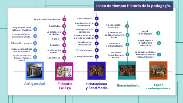 El estudio de la historia de la pedagogía empieza por el pensamiento educativo en la antigua Grecia. Además, se desarrollan las primeras formas de educación en civilizaciones orientales, egipcias y griegas