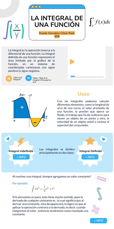 La integral es la operación inversa a la diferencial de una función. La integral definida de una función representa el área limitada por la gráfica de la función, en un sistema de coordenadas cartesianas con signo positivo ly signo negativo.