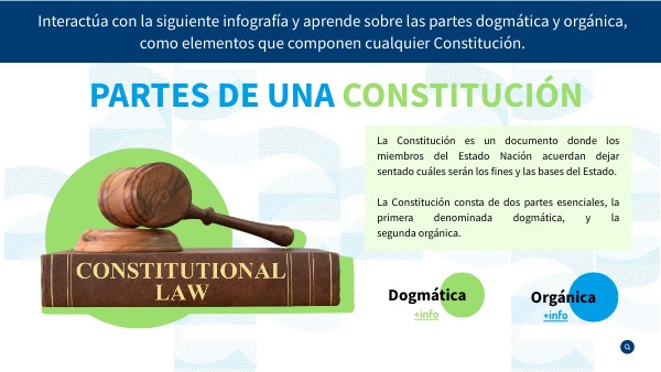 Interactúa con la siguiente infografía y aprende sobre las partes dogmática y orgánica, como elementos que componen cualquier Constitución.