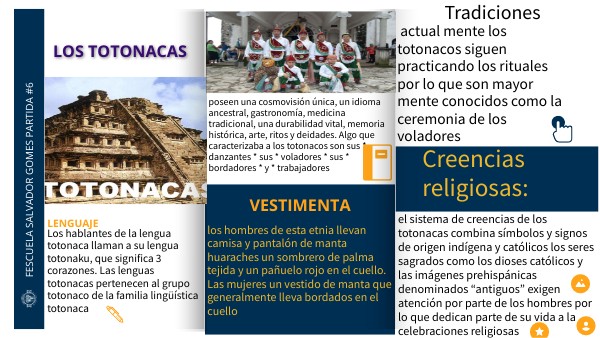 poseen una cosmovisión única, un idioma ancestral, gastronomía, medicina tradicional, una durabilidad vital, memoria histórica, arte, ritos y deidades. Algo que caracterizaba a los totonacos son sus * danzantes * sus * voladores * sus * bordadores * y * trabajadores
