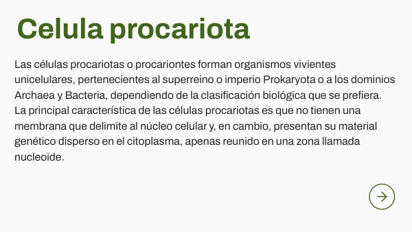 Las células procariotas o procariontes forman organismos vivientes unicelulares, pertenecientes al superreino o imperio Prokaryota o a los dominios Archaea y Bacteria, dependiendo de la clasificación biológica que se prefiera.La principal característica de las células procariotas es que no tienen una membrana que delimite al núcleo celular y, en cambio, presentan su material genético disperso en el citoplasma, apenas reunido en una zona llamada nucleoide.