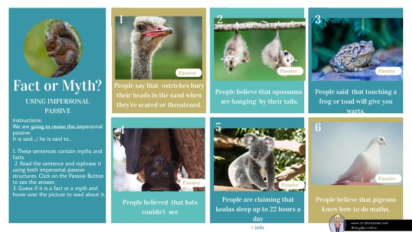 Instructions:We are going to revise the impersonal passive: It is said..../ he is said to... 1. These sentences contain myths and facts 2. Read the sentence and rephrase it using both impersonal passive structures. Click on the Passive Button to see the answer. 3. Guess if it is a fact or a myth and hover over the picture to read about it.