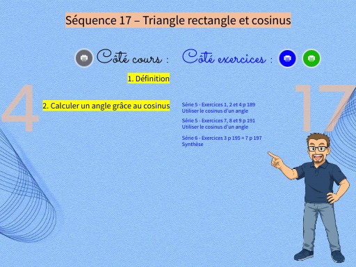 Série 5 - Exercices 1, 2 et 4 p 189 + 7, 8 et 9 p 191 Utiliser le cosinus d’un angle