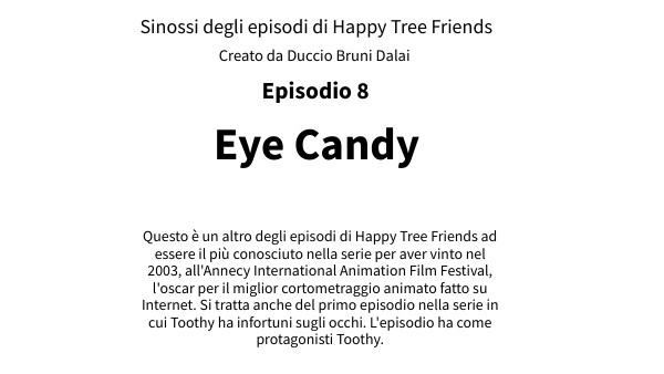 Toothy sta correndo felicemente in un parco tenendo un lecca lecca tra le mani, finché non inciampa accidentalmente su un tronco e si conficca il lecca lecca nell'occhio sinistro.