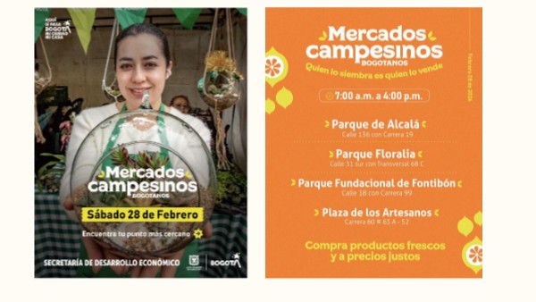HORARIO: 07:00am a 4:00pm MERCADO SUMAPAZ VEREDA SAN JUAN PARQUE VECINAL EL NOGAL Calle 80 con Carrera 11 PLAZOLETA CALLE 85 Calle 85 Carrera 15 PARQUE FUNDACIONAL DE FONTIBÓN Calle 18 con Carrera 99 PLAZA DE LOS ARTESANOS Carrera 60 # 63 A - 52 PARQUE PONTEVEDRA Calle 97 N° 70 C - 69 CIUDADELA COLSUBSIDIO Cra. 111C # 82ª 00