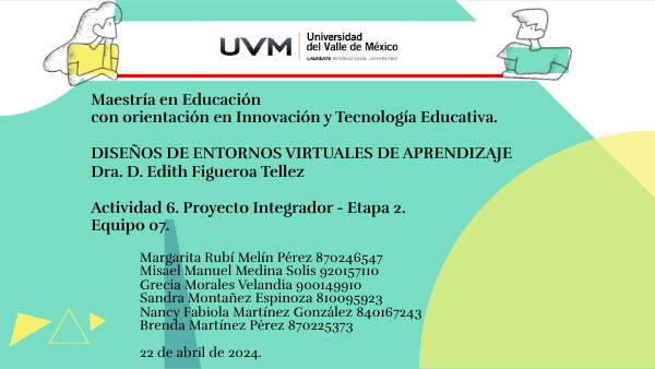 Maestría en Educación con orientación en Innovación y Tecnología Educativa. DISEÑOS DE ENTORNOS VIRTUALES DE APRENDIZAJE Dra. D. Edith Figueroa Tellez Actividad 6. Proyecto Integrador - Etapa 2. Equipo 07.