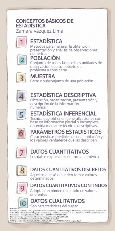 Referencias Saavedra, J. A. (2023, 1 junio). Qué son los datos cualitativos y cuantitativos: tipos, diferencias y cuál es mejor para un análisis de datos. Ebac. https://ebac.mx/blog/datos-cualitativos-y-cuantitativos Tamayo, J. L. (s. f.). Diplomado en Análisis de Información Geoespacial - Conceptos Básicos de Estadística. CENTROGEO REPOSITORIO. https://centrogeo.repositorioinstitucional.mx/jspui/bitstream/1012/157/1/13-Conceptos%20B%C3%A1sicos%20de%20Estad%C3%ADstica%20-%20Diplomado%20en%20An%C3%A1lisis%20de%20Informaci%C3%B3n%20Geoespacial.pdf