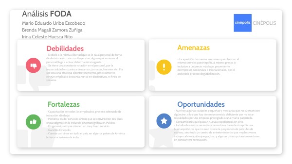 - Capacitación de todos los empleados, proceso adecuado de inducción altrabajo. - Pioneros en dar servicios únicos que se convirtieron des pues enparadigmas en la industria cinematográfica en México. - En general, siempre ofrecen un muy buen servicio - Garantía Cinepolis - Cuenta con cines en todo el país, en algunos países de América latina einclusive en la india.