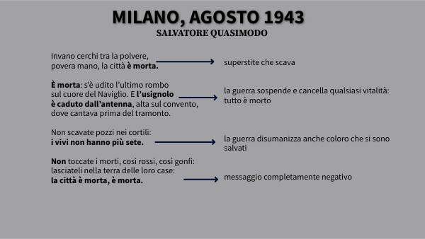 Invano cerchi tra la polvere, povera mano, la città è morta. È morta: s’è udito l’ultimo rombo sul cuore del Naviglio. E l’usignolo è caduto dall’antenna, alta sul convento, dove cantava prima del tramonto. Non scavate pozzi nei cortili: i vivi non hanno più sete. Non toccate i morti, così rossi, così gonfi: lasciateli nella terra delle loro case: la città è morta, è morta.
