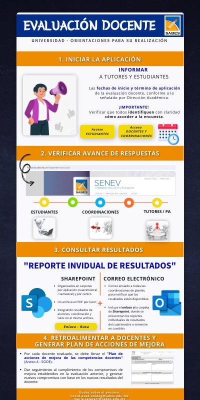 Al término de la aplicación de la evaluación docente, la Dirección Académica genera el "Reporte individual de resultados" de cada tutor. Estos reportes son publicados en el espacio correspondiente en Sharepoint (DA), y se notifica vía correo electrónico a las coordinaciones, para que los consulten y descarguen.