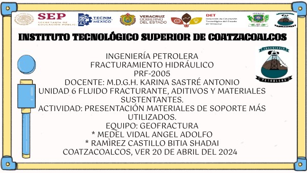INGENIERÍA PETROLERA FRACTURAMIENTO HIDRÁULICO PRF-2005 DOCENTE: M.D.G.H. KARINA SASTRÉ ANTONIO UNIDAD 6 FLUIDO FRACTURANTE, ADITIVOS Y MATERIALES SUSTENTANTES. ACTIVIDAD: PRESENTACIÓN MATERIALES DE SOPORTE MÁS UTILIZADOS. EQUIPO: GEOFRACTURA * MEDEL VIDAL ANGEL ADOLFO * RAMÌREZ CASTILLO BITIA SHADAI COATZACOALCOS, VER 20 DE ABRIL DEL 2024