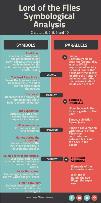 A BIBLICAL PARALLEL: When he was in the forest= garden of the Eden Simon, a christian figure, Jesus. Simon´s conversation with the Lord of the Flies= the confrontation between Jesus and the devil in the desert