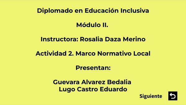 Diplomado en Educación Inclusiva Módulo II. Instructora: Rosalia Daza Merino Actividad 2. Marco Normativo Local Presentan: Guevara Alvarez Bedalia Lugo Castro Eduardo