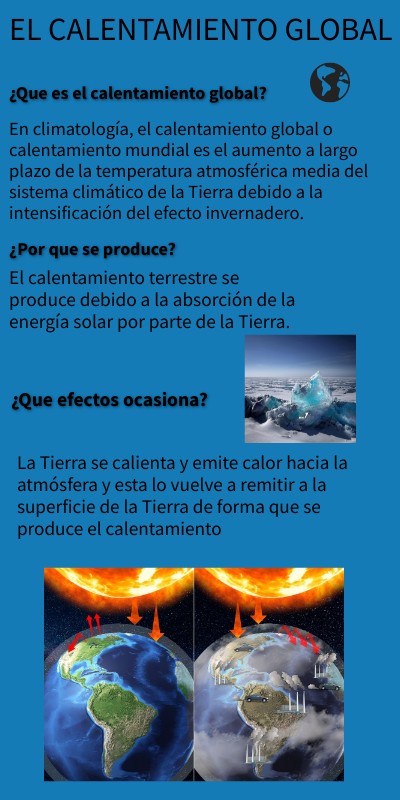 En climatología, el calentamiento global o calentamiento mundial es el aumento a largo plazo de la temperatura atmosférica media del sistema climático de la Tierra debido a la intensificación del efecto invernadero.