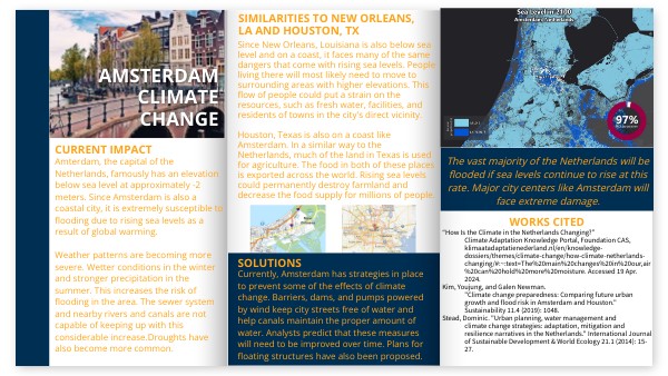 “How Is the Climate in the Netherlands Changing?” Climate Adaptation Knowledge Portal, Foundation CAS, klimaatadaptatienederland.nl/en/knowledge-dossiers/themes/climate-change/how-climate-netherlands-changing/#:~:text=The%20main%20changes%20in%20our,air%20can%20hold%20more%20moisture. Accessed 19 Apr. 2024. Kim, Youjung, and Galen Newman. "Climate change preparedness: Comparing future urban growth and flood risk in Amsterdam and Houston." Sustainability 11.4 (2019): 1048.Stead, Dominic. "Urban planning, water management and climate change strategies: adaptation, mitigation and resilience narratives in the Netherlands." International Journal of Sustainable Development & World Ecology 21.1 (2014): 15-27.