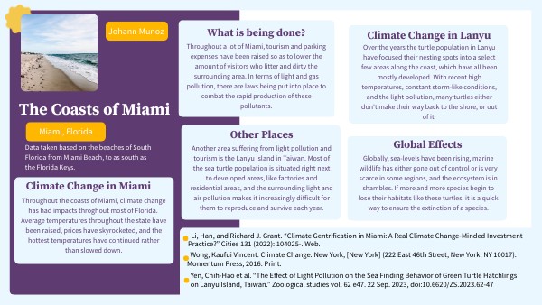 Throughout the coasts of Miami, climate change has had impacts throghout most of Florida. Average temperatures throughout the state have been raised, prices have skyrocketed, and the hottest temperatures have continued rather than slowed down.