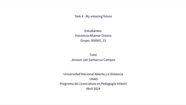 Task 4 - My amazing future Estudiantes: Inocencia Altamar Orozco Grupo: 900005_15 Tutor Jeisson Jair Santacruz Campos Universidad Nacional Abierta y a Distancia UNAD Programa de Licenciatura en Pedagogía Infantil Abril 2024