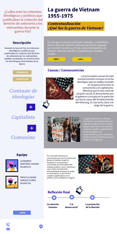 ambos bandos tomaron decisiones estratégicas a lo largo de la guerra que además de violar el derecho a la soberanía (que hace referencia a la independencia, la exclusividad y la limitación del poder de cada estado, así como la no interferencia de poderes externos) también ocasiono consecuencias sociales, políticas y económicas significativas para vietnam. Mediante esta infografía objetivamos promover el derecho a la soberania, mismo que se vio violado durante este conflicto, esperamos haber creado conciencia de la importancia de este derecho al lector, y a cuestionarse si hoy en dia se respeta este derecho o se sigue violando, y en caso de serlo, qué podemos hacer para cambiarlo.
