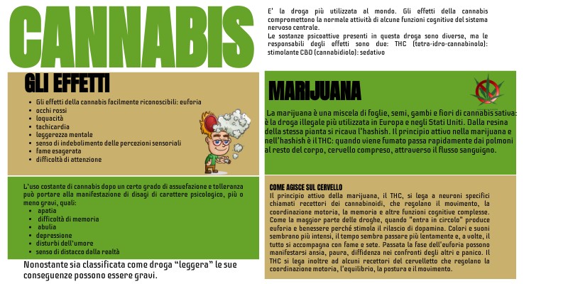 E' la droga più utilizzata al mondo. Gli effetti della cannabis compromettono la normale attività di alcune funzioni cognitive del sistema nervoso centrale.