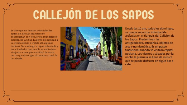 Desde las 10 am, todos los domingos, se puede encontrar infinidad de artículos en el tianguis del Callejón de los Sapos. Predominan las antigüedades, artesanías, objetos de arte y numismática. Es un paseo tradicional cuando se visita la capital poblana. Los viernes y sábados por la noche la plazuela se llena de música que se puede disfrutar en algún bar o café.