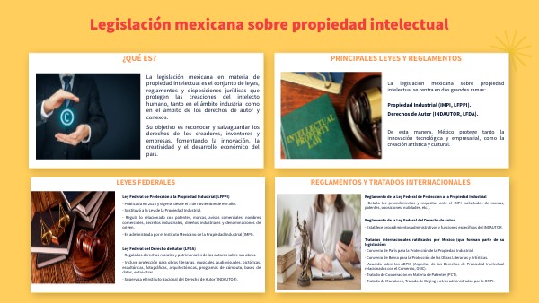 La legislación mexicana sobre propiedad intelectual se centra en dos grandes ramas: Propiedad Industrial (IMPI, LFPPI). Derechos de Autor (INDAUTOR, LFDA). De esta manera, México protege tanto la innovación tecnológica y empresarial, como la creación artística y cultural.