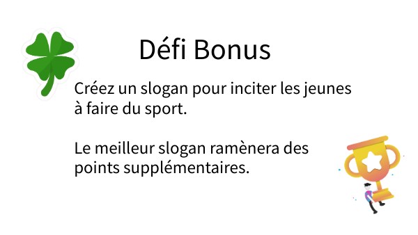 Créez un slogan pour inciter les jeunes à faire du sport. Le meilleur slogan ramènera des points supplémentaires.