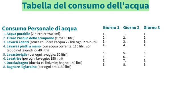 - Lavarsi i denti (senza chiudere l'acqua 22 litri ogni 2 minuti)