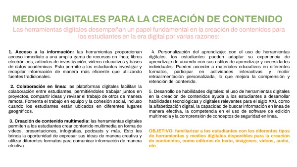 4. Personalización del aprendizaje: con el uso de herramientas digitales, los estudiantes pueden adaptar su experiencia de aprendizaje de acuerdo con sus estilos de aprendizaje y necesidades individuales. Pueden acceder a materiales educativos en diferentes formatos, participar en actividades interactivas y recibir retroalimentación personalizada, lo que mejora la comprensión y retención del contenido. 5. Desarrollo de habilidades digitales: el uso de herramientas digitales en la creación de contenidos ayuda a los estudiantes a desarrollar habilidades tecnológicas y digitales relevantes para el siglo XXI, como la alfabetización digital, la capacidad de buscar información en línea de manera efectiva, la competencia en el uso de software de edición multimedia y la comprensión de conceptos de seguridad en línea. OBJETIVO: familiarizar a los estudiantes con los diferentes tipos de herramientas y medios digitales disponibles para la creación de contenidos, como editores de texto, imágenes, videos, audio, etc.
