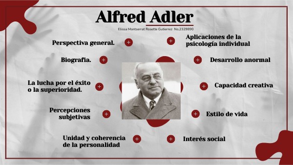 》Alfred Adler nació el 7 de febrero de 1870 en Rudolfsheim, una ciudad cercana a Viena.》Debido a una experinecia cerca de la muerte, junto con la muerte de un hermano menor, despertaron un interés por la medicina en Adler. 》Estaba muy interesado en las relaciones sociales. 》Adler era más democrático, se reunía a menudo con sus colegas y amigos en cafeterías de Viena, donde tocaban el piano y cantaban canciones. 》A finales del año 1895, había cumplido su objetivo de hacerse médico.Abrió una consulta privada de oftalmología, pero dejó esta especialidad para dedicarse a la psiquiatría y a la medicina general. 》En 1902 Freud invito a Adler y a otros médicos a una reunio para hablar de psicología y neuropatología, sin embargo Adler nunca se considero mentor de Freud. 》Tanto Adler como Freud reconocieron finalmente que sus diferencias eran irreconciliables y, en octubre de 1911, Adler dimitió como presidente y miembro de la Sociedad Psicoanalítica. 》Después de la guerra consiguió promover sus teorías mediante conferencias y creo clínicas de orientación infantil. 》Murió el 28 de mayo de 1937 en Aberdeen, en Escocia de un ataque al corazón