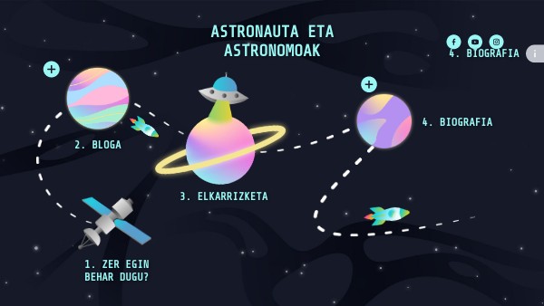 1. BLOG: imaginatu astronauta bat zarela eta blog batean egun batean zehar egiten duzuna kontatu behar duzu. 2. ELKARRIZKETA: astronauta bati elkarrizketa imaginarioa egingo diozue, hau da, galderak prestatu eta interneteko informazioarekin erantzunak osatu. 3. BIOGRAFIA: astronomo ezberdinen biografiak idatziko dituzue.