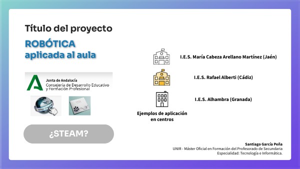 - I.E.S. Rafael Alberti. (s. f.). Proyecto STEAM: Robótica aplicada al aula. https://iesrafaelalberti.es/steam-robotica-aplicada-al-aula/