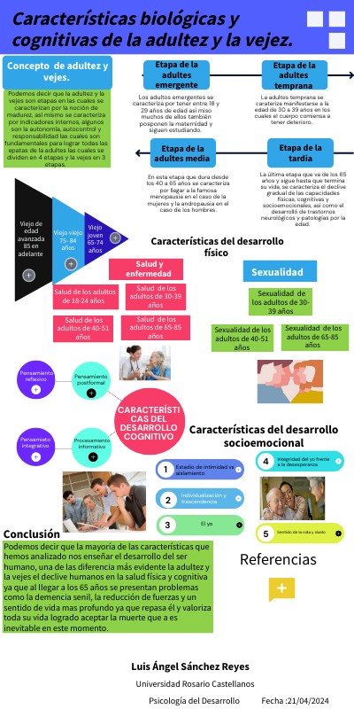 CCC - Adultez. (2022, diciembre). https://www.cienciascognitivascorporizadas.com/temas-selectos/ciclo-de-vida/adultez Nahum Montagud Rubio. (2021, diciembre 7). Adultez temprana: qué es, características y efectos en la mente y el cuerpo. Portal Psicología y Mente. https://psicologiaymente.com/desarrollo/adultez-temprana Nahum Montagud Rubio. (2021, diciembre 7). Adultez tardía: qué es, características y cómo nos afecta. Portal Psicología y Mente. https://psicologiaymente.com/desarrollo/adultez-tardia García, A. M. A., & Maya, Á. M. S. (2014). Análisis del concepto de envejecimiento. Gerokomos, 25(2), 57–62. https://doi.org/10.4321/s1134-928x2014000200002 Perojo, R. L. D. (2022, August 28). Educación y pensamiento reflexivo en John Dewey. Dialektika. https://dialektika.org/2020/06/13/educacion-pensamiento-reflexivo-teoria-john-dewey/ Psicología, A. E. (2007). Erik Erikson y el desarrollo psicosocial deficiente como camino a las conductas antisociales y criminales. https://www.alternativas.me/40-numero-50-febrero-julio-2023/305-erik-erikson-y-el-desarrollo-psicosocial-deficiente-como-camino-a-las-conductas-antisociales-y-criminales URC. (2024). Adultez y Vejez. https://edu.rcastellanos.cdmx.gob.mx/lad_A2/pluginfile.php/4351/mod_resource/content/4/LPSI2PSI12_Contenido_M4.pdf