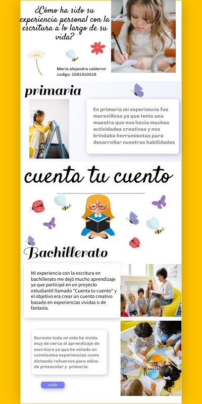 Mi experiencia con la escritura en bachillerato me dejó mucho aprendizaje ya que participé en un proyecto estudiantil llamado "Cuenta tu cuento" y el objetivo era crear un cuento creativo basado en experiencias vividas o de fantasia.