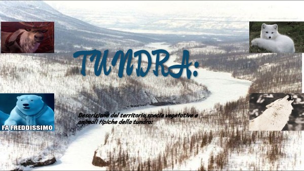Il termine tundra viene dal lappone e significa pianura senza alberi.Non crescono gli alberi perchè il terreno è gelato e le radici non crescono.La tundra si estende nelle zone colorate di blu,vicino al circolo polare artico,ai margini delle regioni perennamente ricoperte da ghiacci,dove il terreno è ghiacciato in profondità.In generale è molto umido perchè l'acqua non può penetrare in profondità.