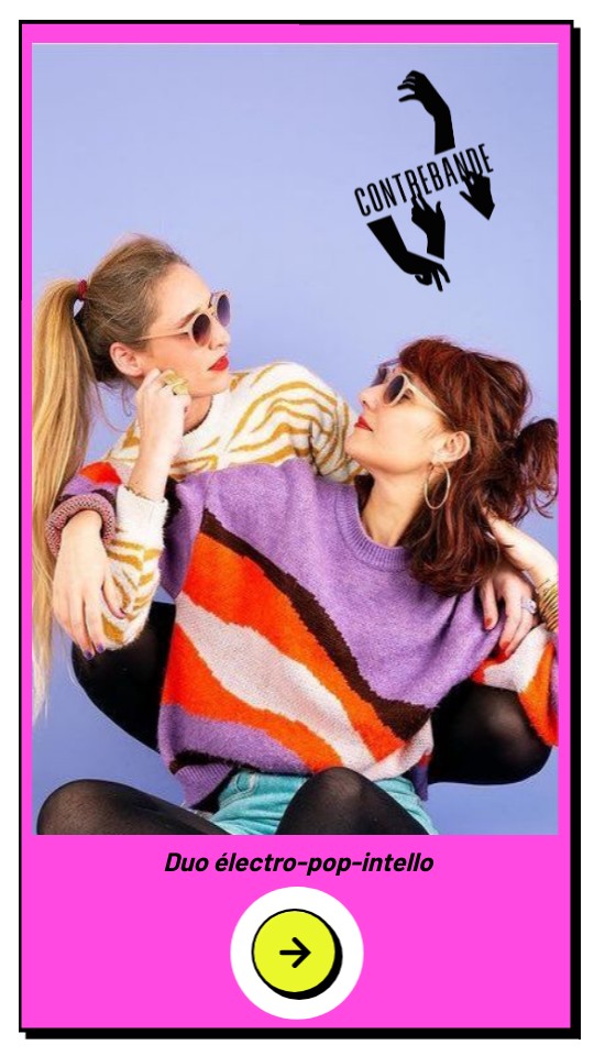 Contrebande est un duo féminin d’électro-pop-intello mené par deux psychologues quarantenaires. Elles allient l’enthousiasme des synthés vintage rétro 80’s et des textes engagés en français. Sous l’allure de conversations drôles et détachées, Contrebande s’inspire des histoires et des préoccupations collectives de leurs patients pour aborder des sujets de société dans lesquelles chacun peut se retrouver. Quelque part entre Niagara, L’Impératrice et Colette Magny, elles apportent une proposition nouvelle… mais évidente !