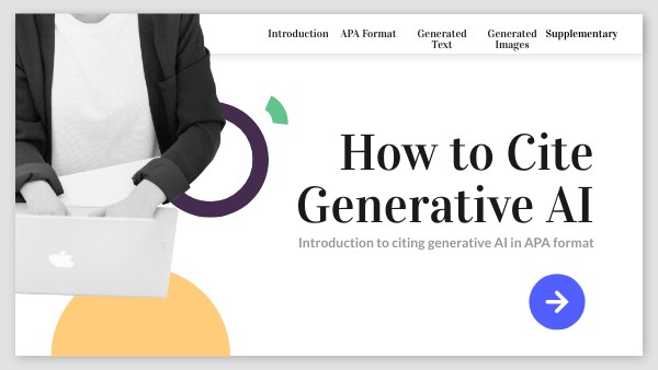 APA format, short for American Psychological Association format, is a style guide widely used in academic writing and citing sources. Typically, a reference list is arranged alphabetically by author's last name that includes the author's name, publication year, title of the work, publication information, and any relevant identifiers (e.g., DOI or URL). We highlight this importance if information from generative AI is used, it needs to be cited just like any other source.