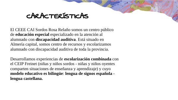 El CEEE CAI Sordos Rosa Relaño somos un centro público de educación especial especializado en la atención al alumnado con discapacidad auditiva. Está situado en Almería capital, somos centro de recursos y escolarizamos alumnado con discapacidad auditiva de toda la provincia. Desarrollamos experiencias de escolarización combinada con el CEIP Freinet (niñas y niños sordos - niñas y niños oyentes comparten situaciones de enseñanza y aprendizaje) y cuyo modelo educativo es bilingüe: lengua de signos española - lengua castellana.