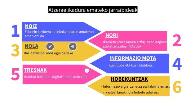 - Informazio argia, zehatza eta laburra eman. - Ikasleei lanak nola hobetu adierazi.