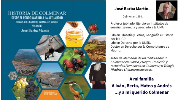 Profesor jubilado. Ejerció en institutos de enseñanza media y asociado a la UMA. Ldo en Filosofía y Letras, Geografía e Historia por la UGR. Ldo en Derecho por la UNED. Doctor en Derecho por la Complutense de Madrid. Autor de Memorias de un Pleito Andaluz, Colmenar en Blanco y Negro. Tradición y recuerdos Flamencos en Colmenar; o Trilogía Histórico Literaria entre otros.