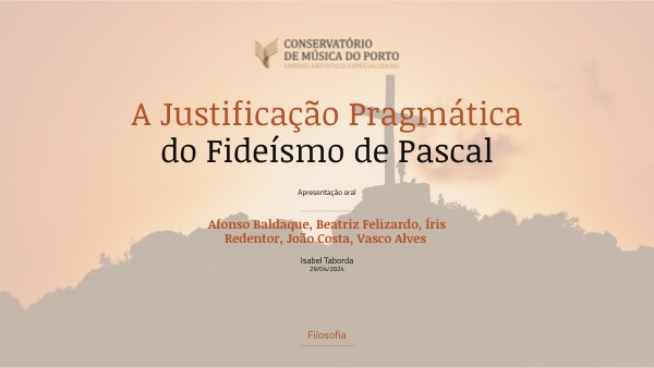 Blaise Pascal (1623-1662) foi um matemático, físico, filósofo e teólogo francês. Inventou a primeira calculadora mecânica aos 19 anos e contribuiu para a geometria projetiva. A sua obra filosófica mais famosa é "Pensées", onde apresenta a "Aposta Pascalina". Este faleceu aos 39 anos, deixando um legado duradouro em várias áreas do conhecimento.