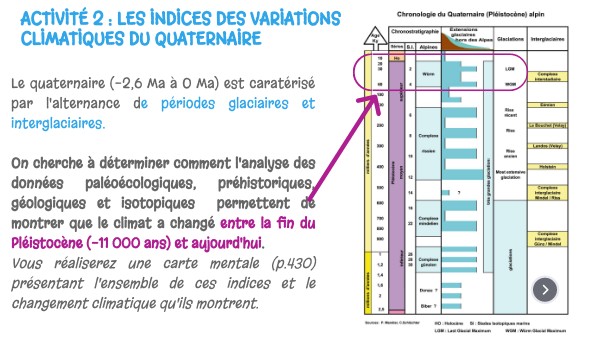 Le quaternaire (-2,6 Ma à O Ma) est caratérisé par l'alternance de périodes glaciaires et interglaciaires.On cherche à déterminer comment l'analyse des données paléoécologiques, préhistoriques, géologiques et isotopiques permettent de montrer que le climat a changé entre la fin du Pléistocène (-11 000 ans) et aujourd'hui. Vous réaliserez une carte mentale (p.430) présentant l'ensemble de ces indices et le changement climatique qu'ils montrent.