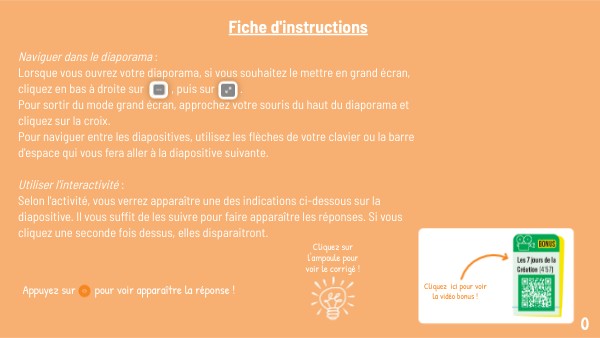 Utiliser l'interactivité : Selon l'activité, vous verrez apparaître une des indications ci-dessous sur la diapositive. Il vous suffit de les suivre pour faire apparaître les réponses. Si vous cliquez une seconde fois dessus, elles disparaitront.