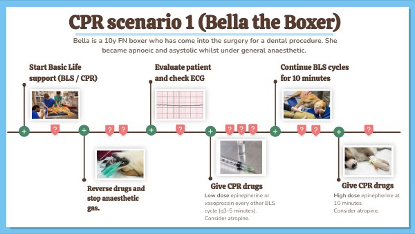 Bella is a 10y FN boxer who has come into the surgery for a dental procedure. She became apnoeic and asystolic whilst under general anaesthetic.