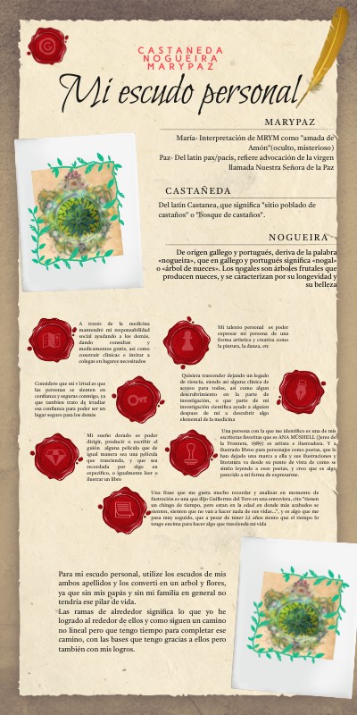 Para mi escudo personal, utilize los escudos de mis ambos apellidos y los converti en un arbol y flores, ya que sin mis papás y sin mi familia en general no tendría ese pilar de vida. Las ramas de alrededor significa lo que yo he logrado al rededor de ellos y como siguen un camino no lineal pero que tengo tiempo para completar ese camino, con las bases que tengo gracias a ellos pero también con mis logros.