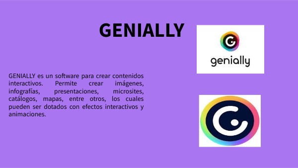 GENIALLY es un software para crear contenidos interactivos. Permite crear imágenes, infografías, presentaciones, microsites, catálogos, mapas, entre otros, los cuales pueden ser dotados con efectos interactivos y animaciones.