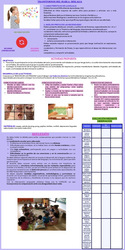 1. CARACTERÍSTICAS DE LA DISLALIADislalia funcional (Dificultad de Aprendizaje, DA)Dificultad en niños mayores de cuatro años para producir o articular uno o más fonemas, descartándose daño en el Sistema nervioso Central o Periférico o deformaciones fisiológicas o anatómicas en los órganos articulatorios. Se debe tratar para evitar que el perfil neuropsicológico del niño se vea afectado. 2. ANÁLISIS PREVIO DE LAS NECESIDADESMateo presenta dislalia por omisión y sustitución de fonemas, especialmente /m/, /n/ y /ñ/, comórbida con un Trastorno del lenguaje, básicamente caracterizado por: vocabulario reducido, estructura gramatical limitada y deterioro del discurso, aunque la comprensión está preservada. Estas afectaciones provocan en él: